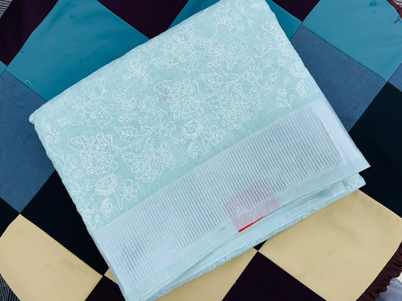 Blue color saree with two side silver zairy borders and on body rich thread work blouse is same color