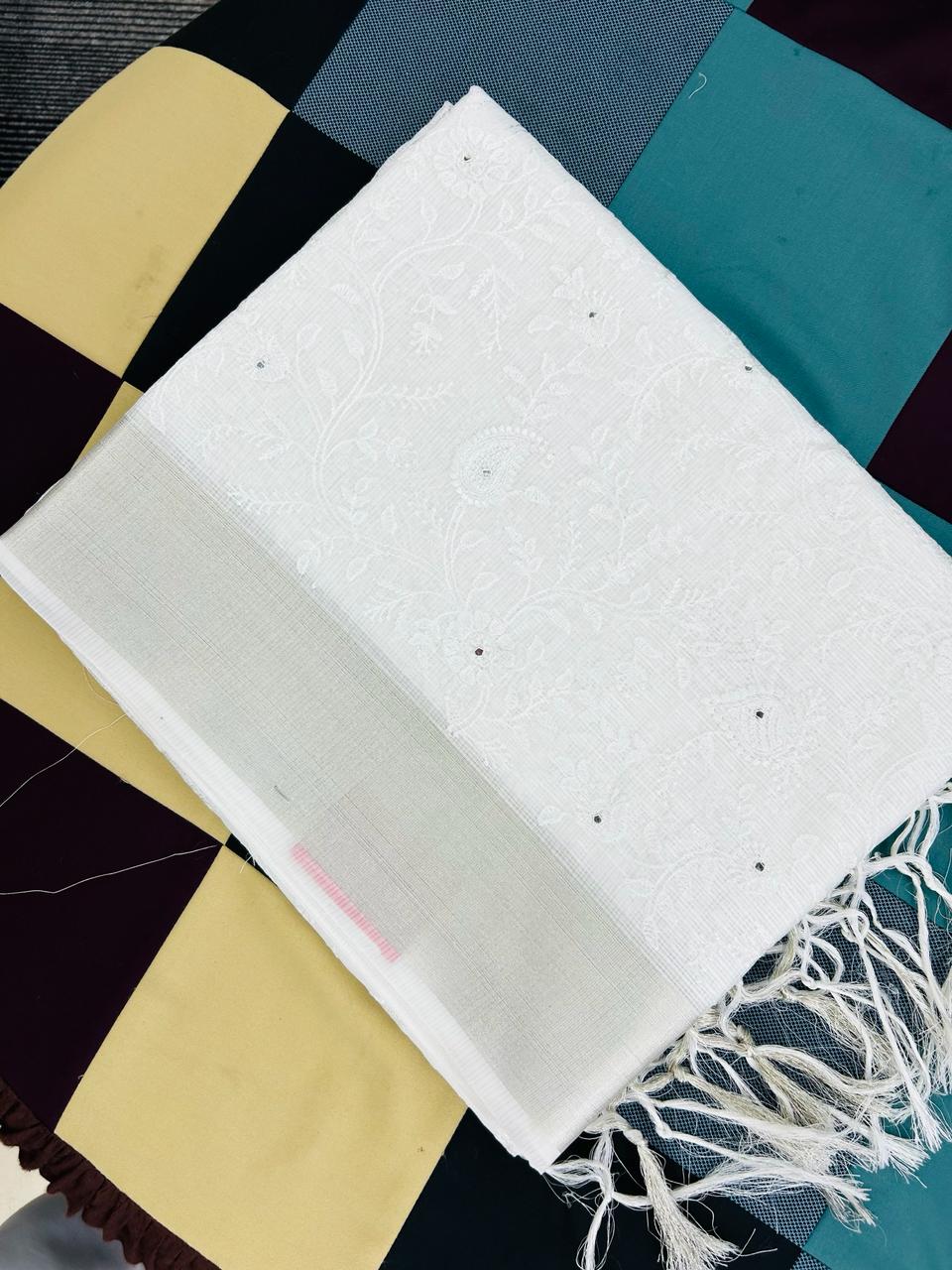 White color saree with two side silver zairy borders and on body rich thread work and sequence work, blouse is same color