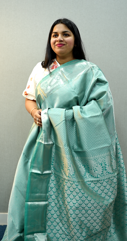 Safer green shade saree with rich silver zairy butta design on body and rich silver zairy design on border and pallu blouse is plain with silver borders