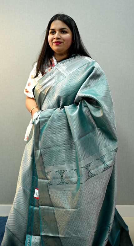Tarquish blue shade saree with rich silver zairy butta design on body and rich silver zairy design on border and pallu blouse is plain with silver borders