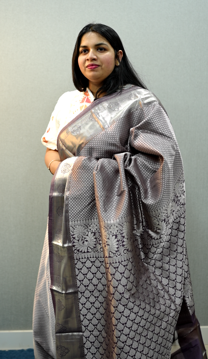 Violet shade saree with rich silver zairy butta design on body and rich silver zairy design on border and pallu blouse is plain with silver borders