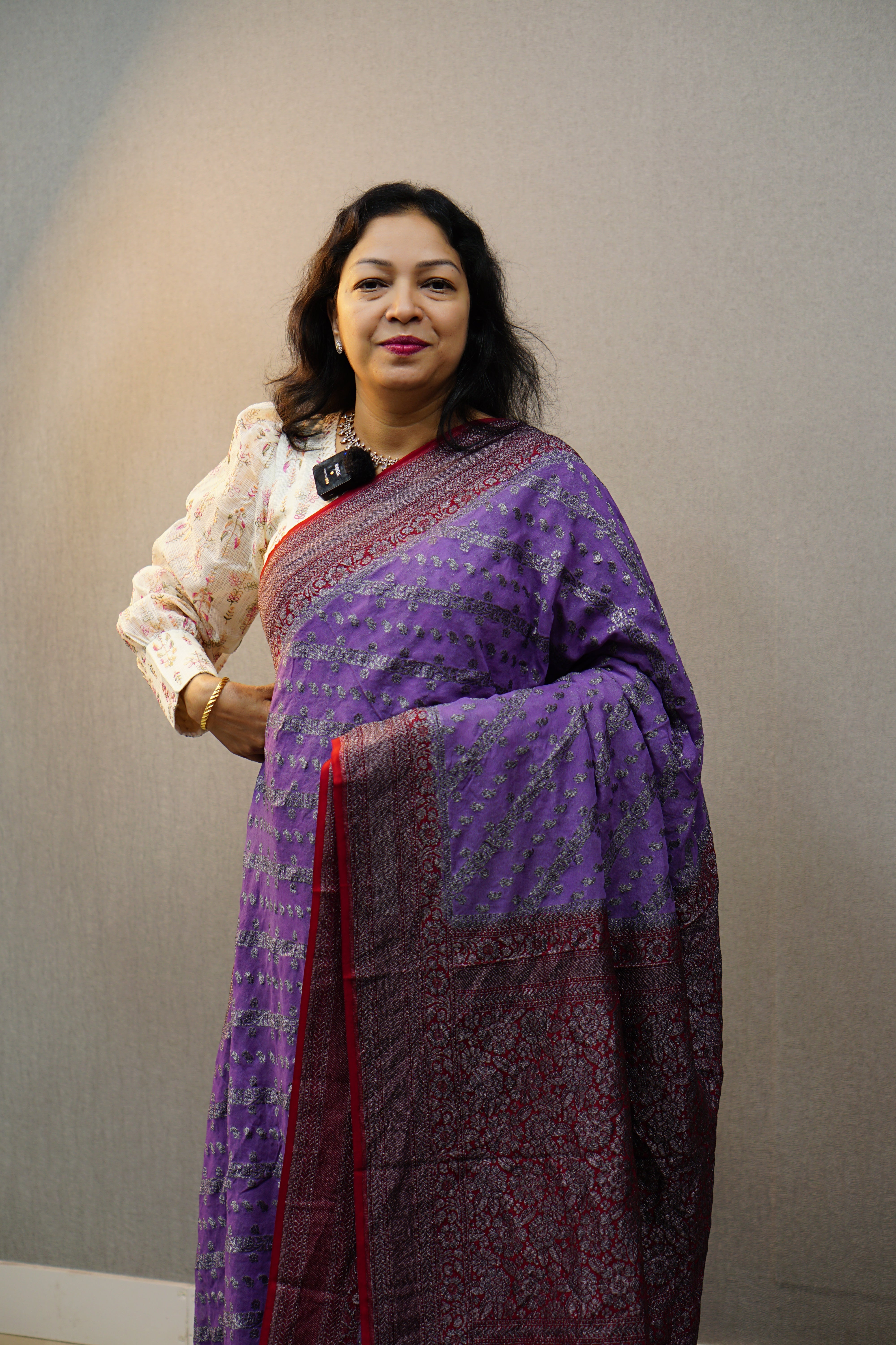 Purple lavander mix color saree with black zairy work all over with two side borders in marron blouse is kukum marrron color