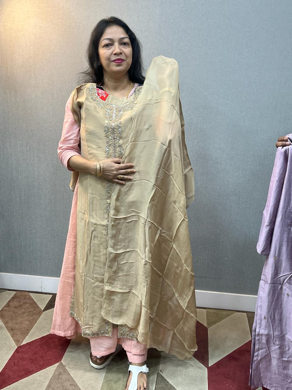 Chiku colour salwar suit set with hand work on yoke portion small design on body and dupatta same colour with butta design