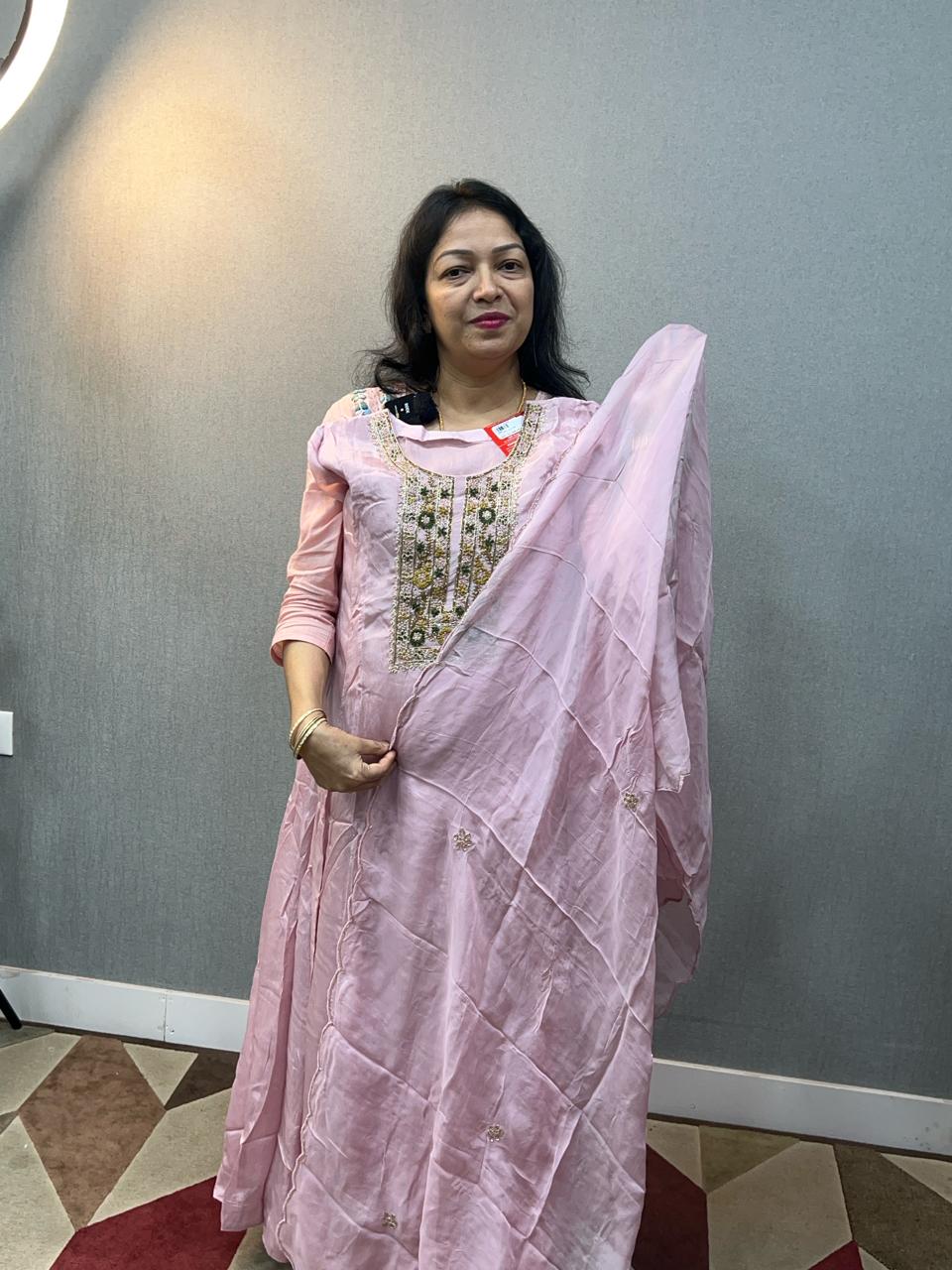Lavender colour salwar suit set with hand work on yoke portion small design on body and dupatta same colour with butta design