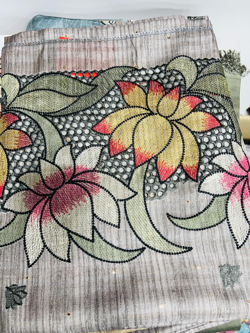 Blueish gray color with sequence work on body and cut work on damn side dupatta is printed and same color bottom